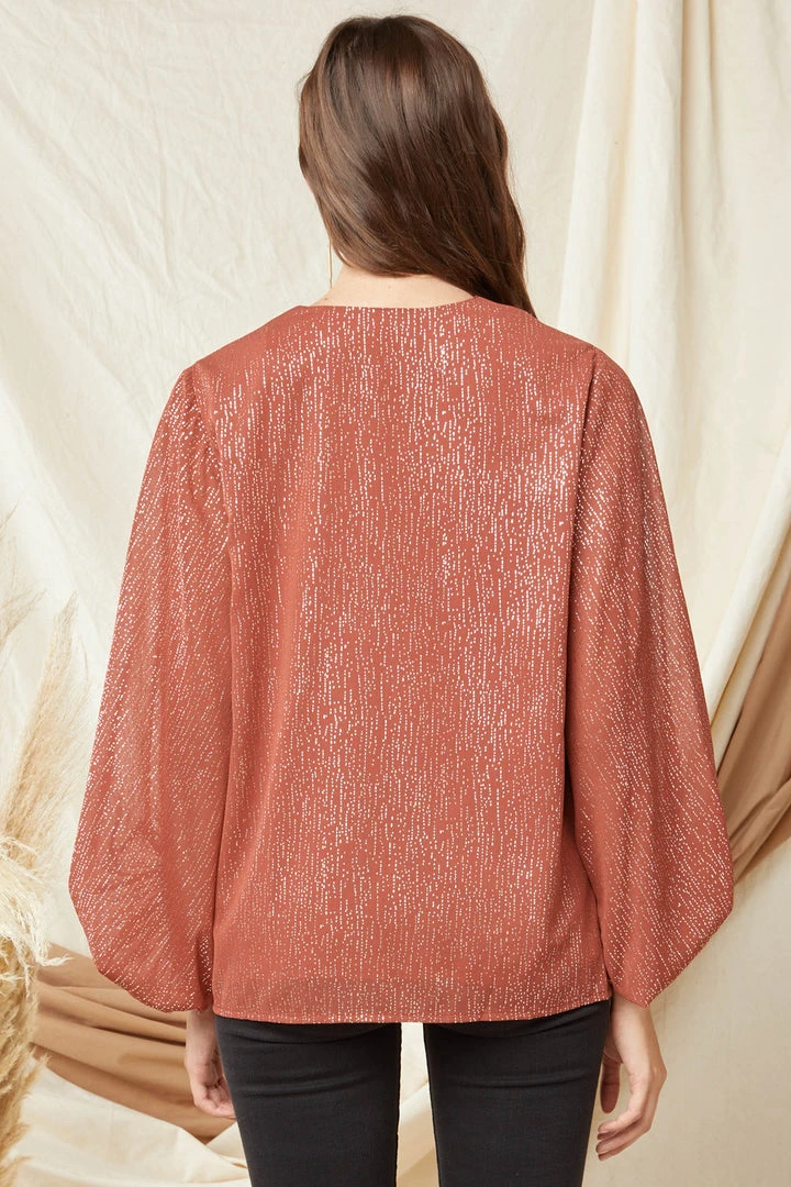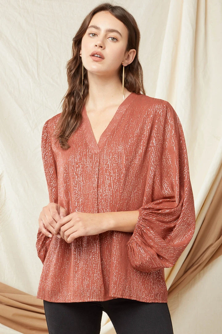 We are over the moon about this super cute relaxed fit blouse! Featuring elastic cuffed bubble sleeves, a v neckline, and the prettiest flowy fabric. This hot babe is a marsala color with gold metallic speckles all over, for the perfect amount of shimmer! Can be worn long, or with a side tuck, the choice is yours. Such a pretty top, super cute and comfortable, and very versatile!