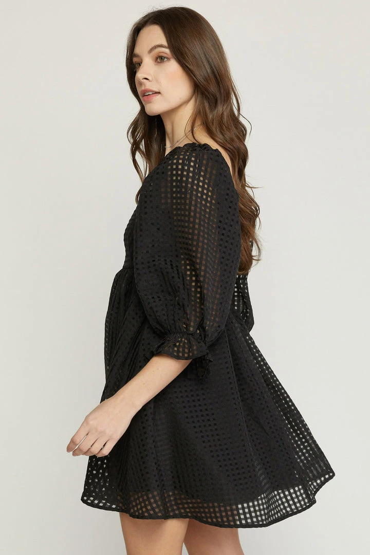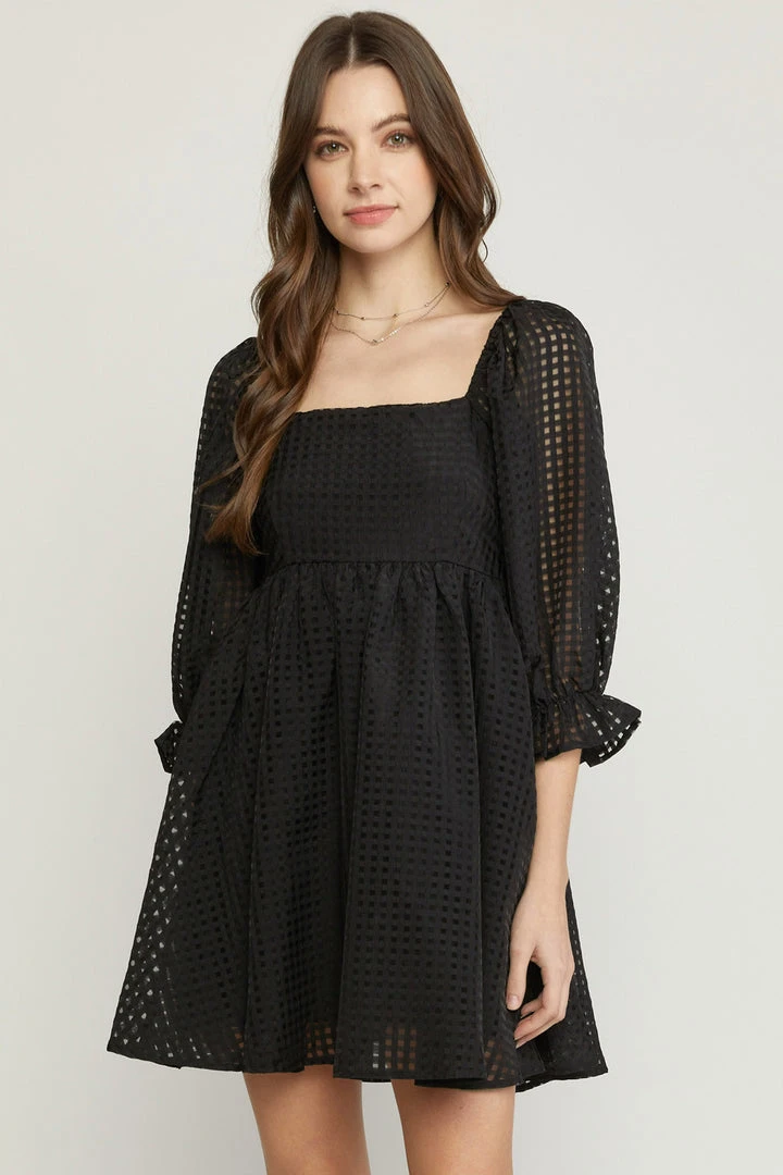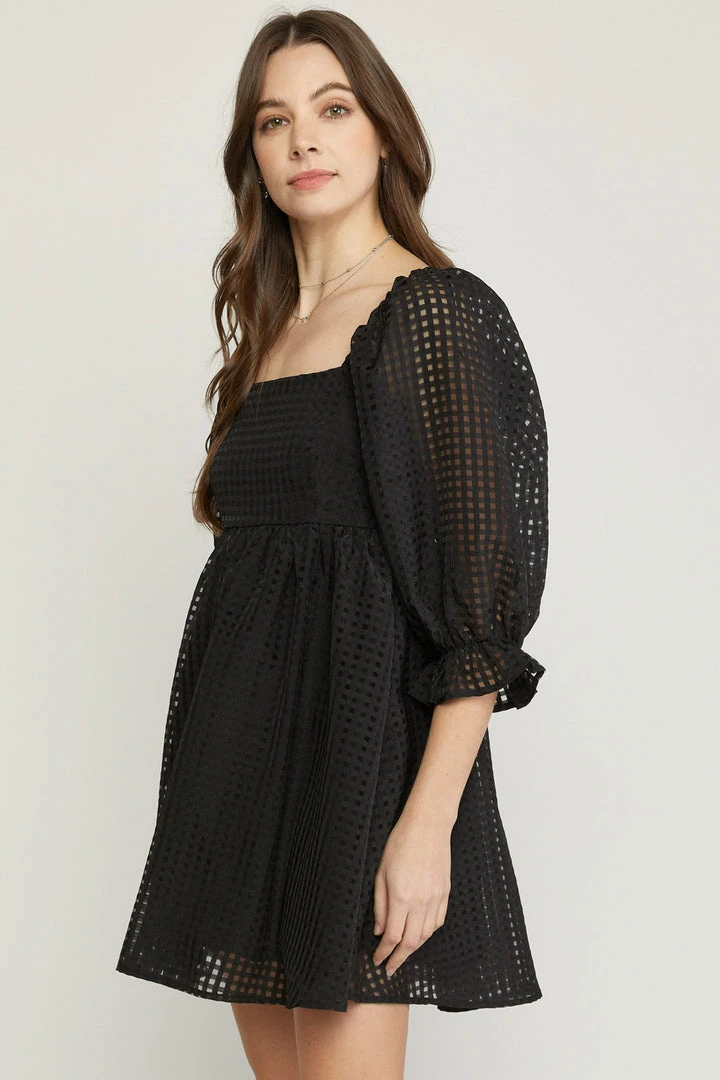 Get ready for all of your upcoming events with this super cute babydoll dress. Featuring a lightweight flowy black fabric in a grid print, square neckline with smocking in back, and elastic ruffle cuffed long sheer sleeves. This babe is perfect dressed up with heels, or dressed down with sandals. She’ll be your new fav either way!