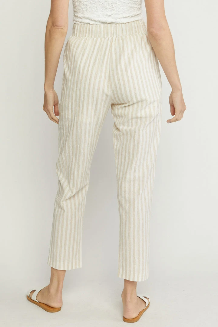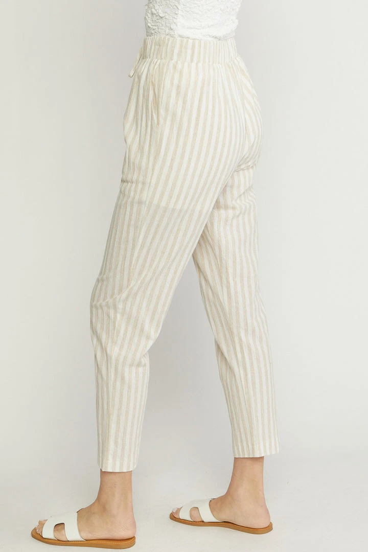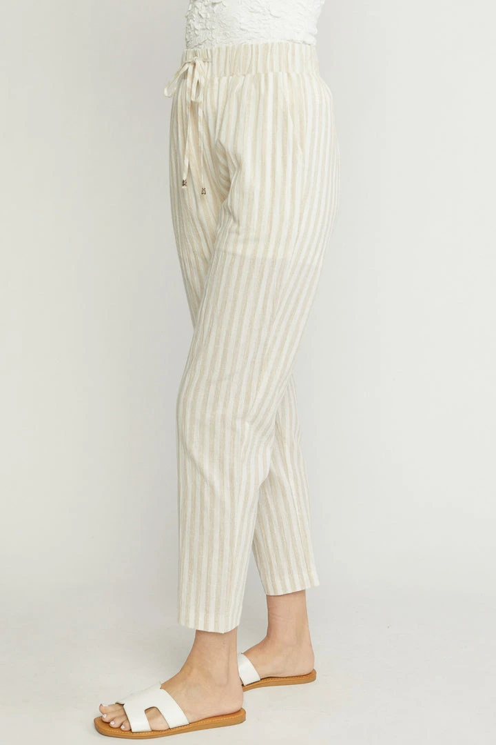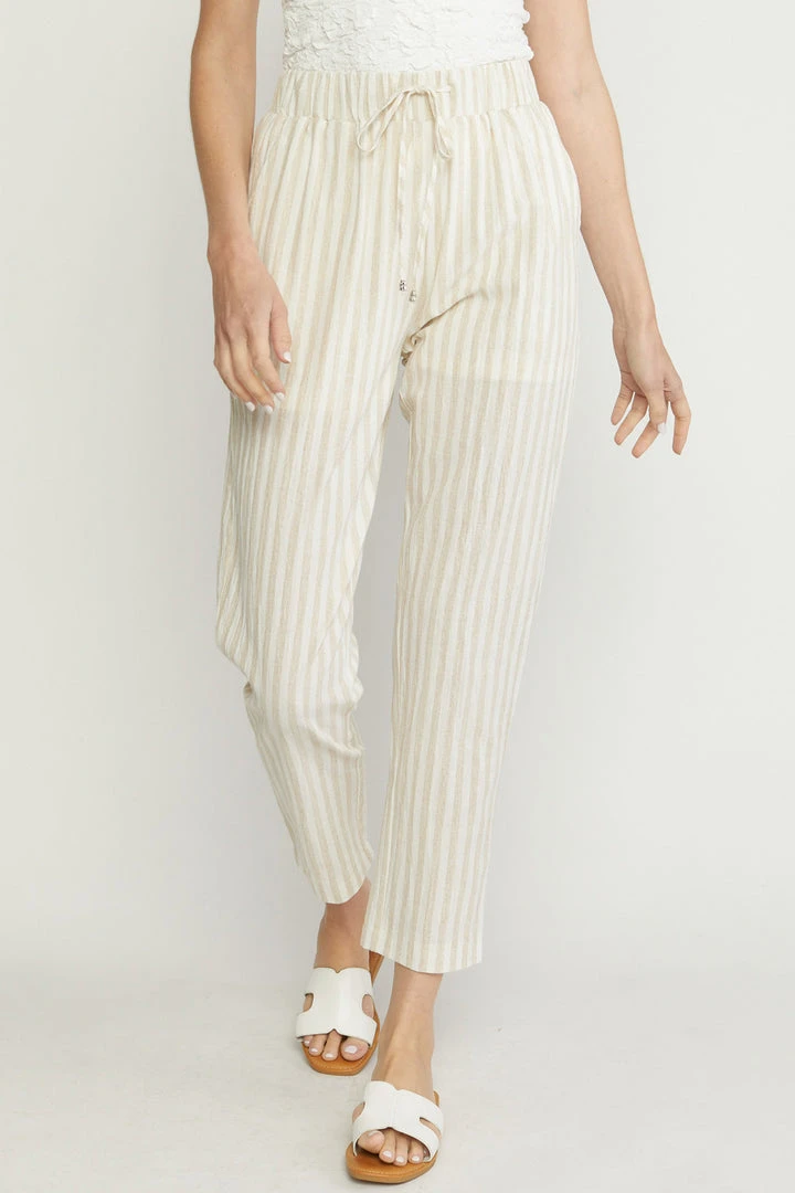 These lightweight taupe and ivory striped pants are perfect for everything from running errands to day dates. Pair with a simple tee and your favorite sandals or sneaks for an easy but trendy look. These cuties have side pockets, drawstring elastic high waistband, tapered ankle, and are lined with shorts.