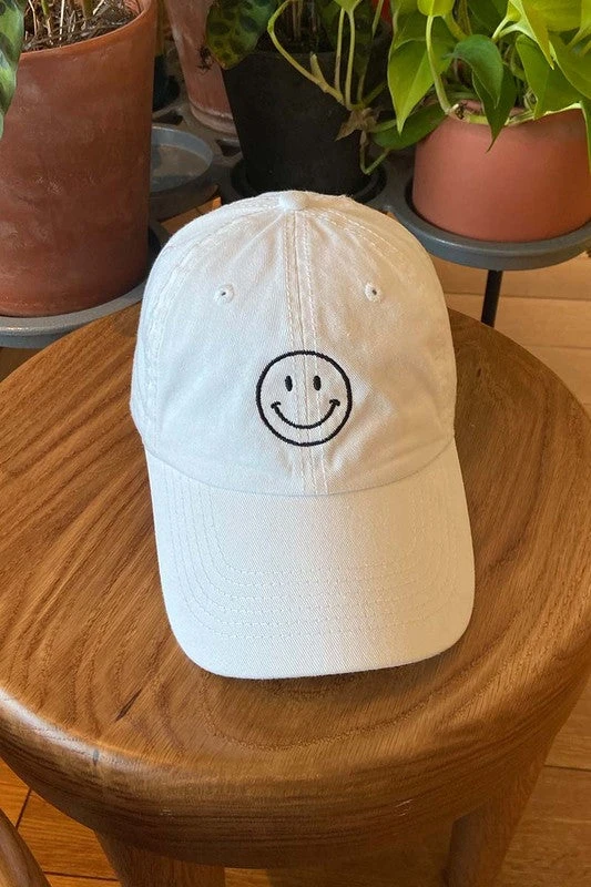 Stay smiling everyday in the cutest embroidery smiley face baseball cap! Features an adjustable metal clasp.