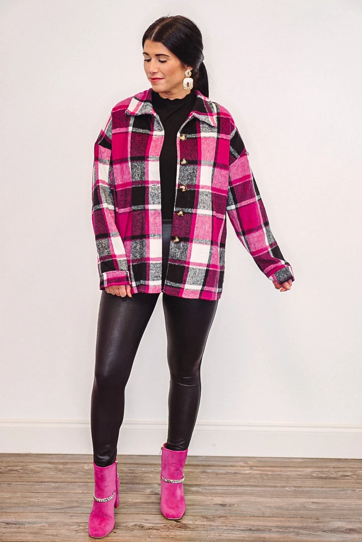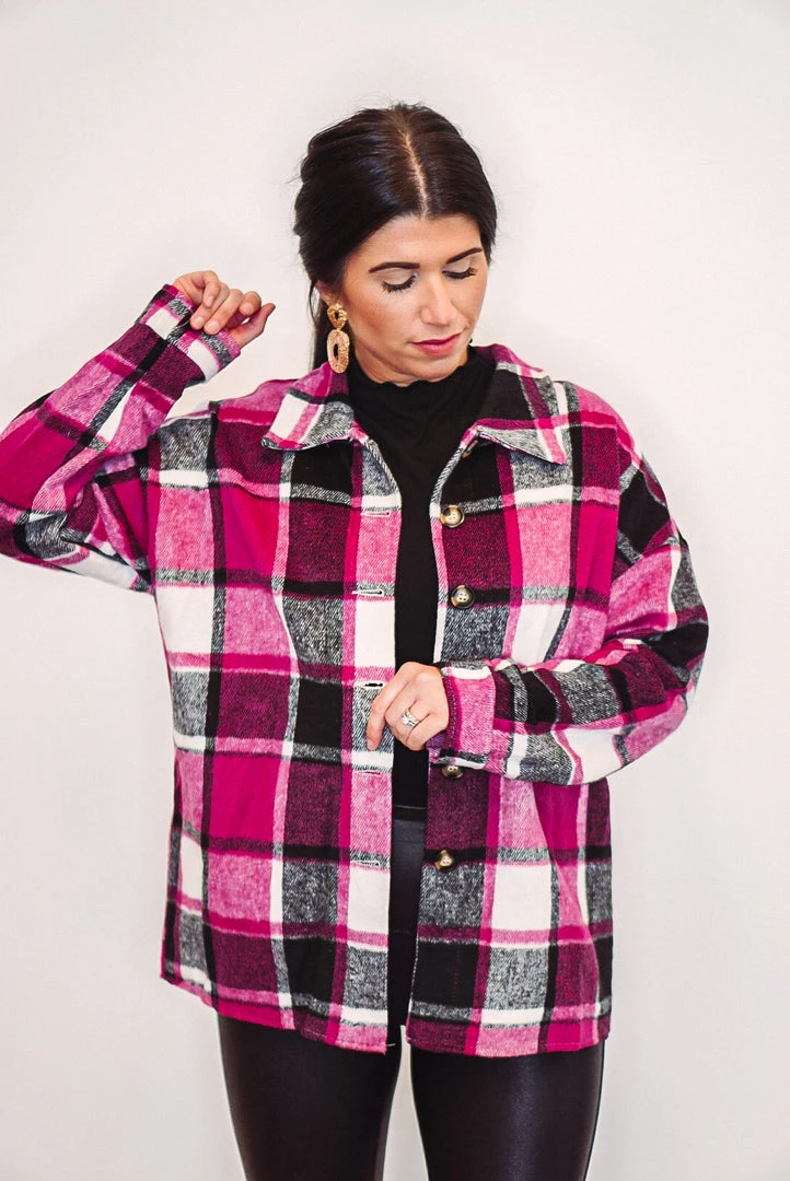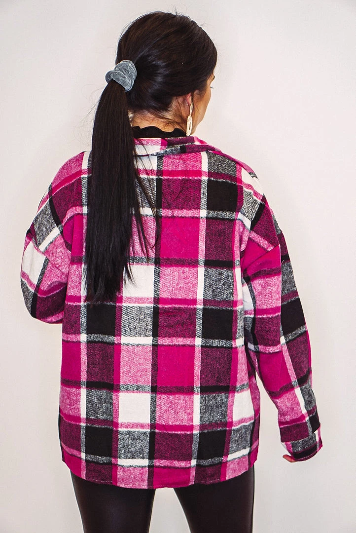 We are loving this hot pink, white and black plaid flannel shacket, it’s a must have trend this season. It features soft fabric, button up style, and mid weight fabric to keep you warm and cozy. It’ll be the perfect addition to your wardrobe and great to layer with your bodysuits and jeans. We love the relaxed fit… this shacket is a must have!!