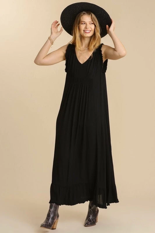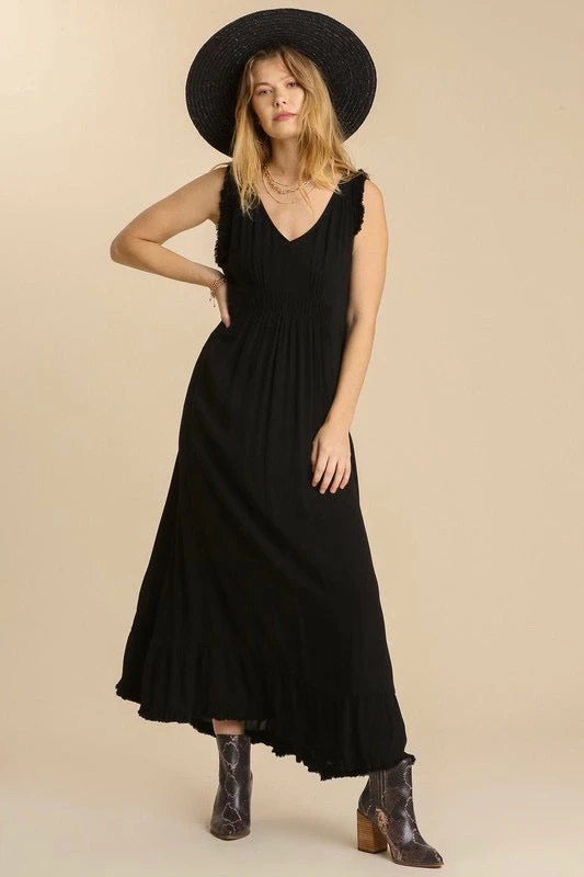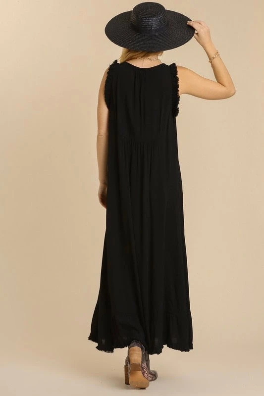 Black Sleeveless Maxi Dress With Ruffle Frayed Hemlines
