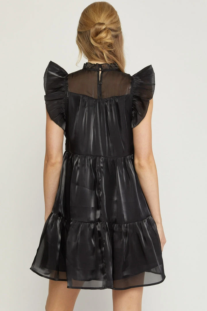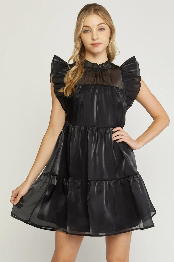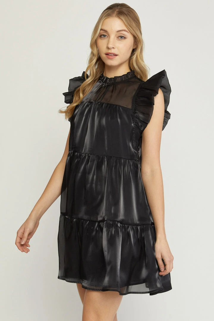 Sweet meets sassy in this super cute black babydoll dress. Featuring an iridescent flowy fabric, tiered layers, ruffled mock neck with double button closure in back, and ruffle capped sleeves. This one will be perfect dressed up for all of your upcoming events, and is so pretty!