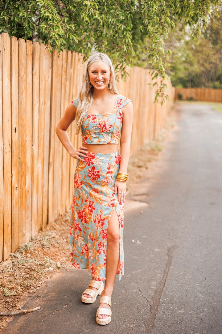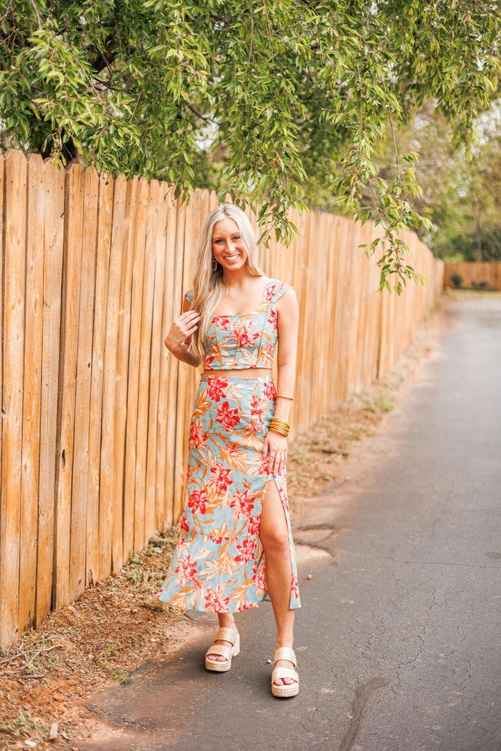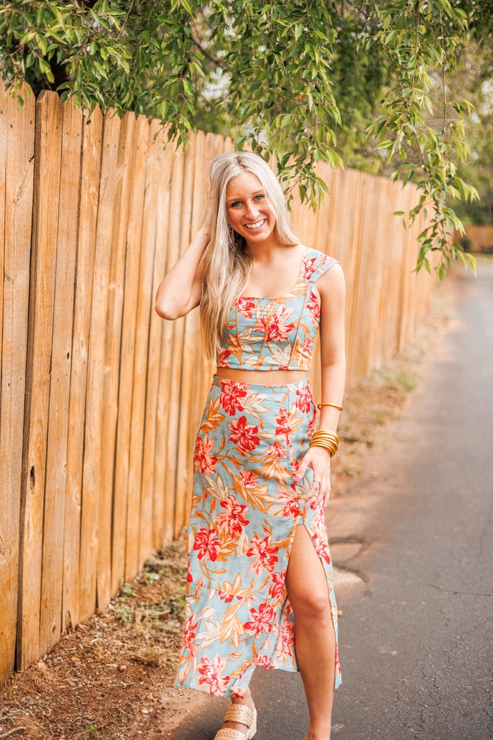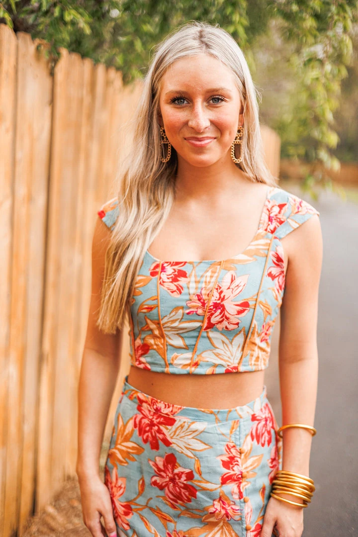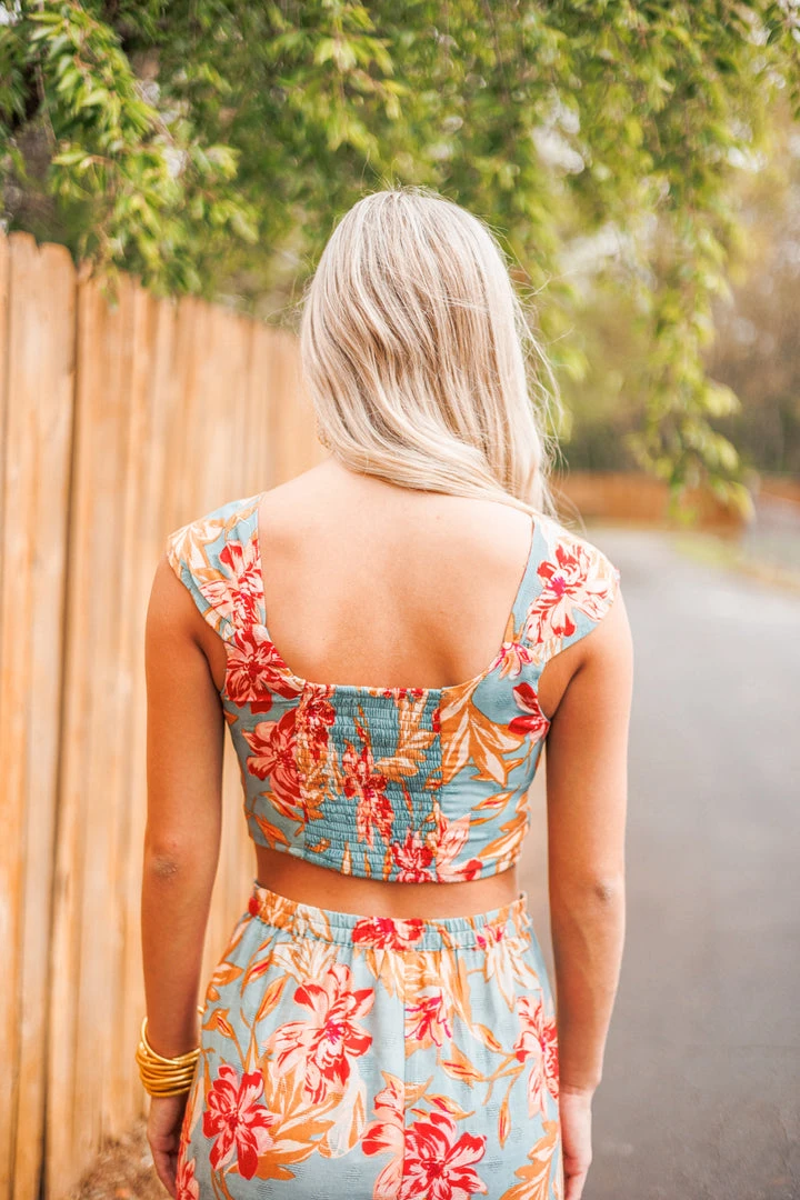 We can hear Summer calling with this super cute cropped top! Featuring a scoop neckline, pleated shoulder straps, and smocked back, all in a slate color with red floral print textured fabric and exposed seam details. Absolutely stunning! Colors: red, slate, pink, beige, tan, and light blue. Pair with the matching skirt for a fab outfit: Island Blue Floral Midi Skirt