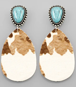 Cow print is a must have this season! We are loving these genuine leather ivory and tan cowhide teardrop earrings featuring a turquoise stone post. So CUTE!!