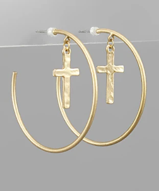 These are the sweetest hoop earrings! Worn gold hoop with a gold cross dangling inside the hoop from the top. Such a cute statement piece!