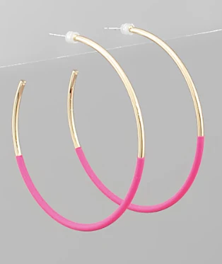 Hoop earrings are a must have this season! We are loving these fuchsia half coated gold hoops. They are perfect for all of your upcoming events!