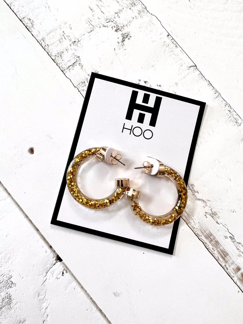 These babes are sooo cute! Acrylic mini hoop earrings in gold foil, hypoallergenic, and lightweight. Love, love, love!!