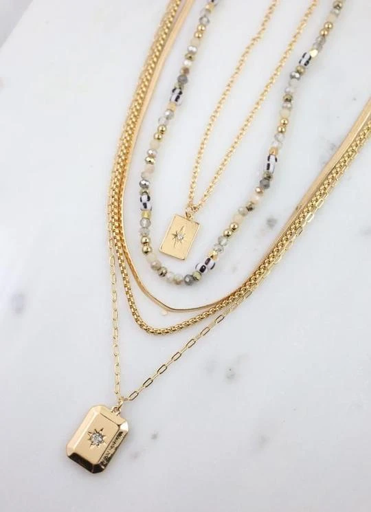 This necklace has five different textured strands. There is an accent beaded strand and CZ starburst rectangular accents.