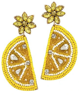We can hear Summer calling with these beautiful lemon slice earrings! Featuring a yellow jewel flower at the post above a yellow and white beaded lemon slice, accented with clear jewels. Soooo CUTE!!