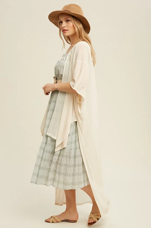 How fabulous is this duster!? Natural color loose knit fabric with solid knit fabric down the draped sleeves, and sides. Featuring an open front, shortened front hem, side slits, and a relaxed flowy fit. Perfect as a layering piece over your cute outfits, or as a swimsuit cover. So versatile, you will love her year round!