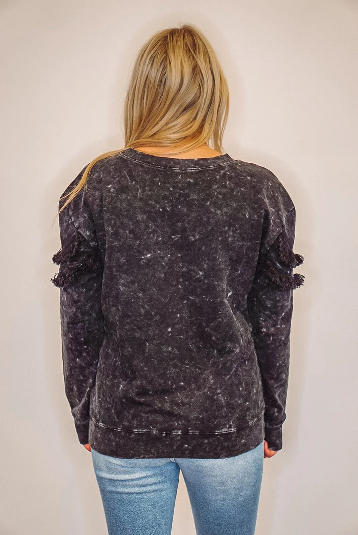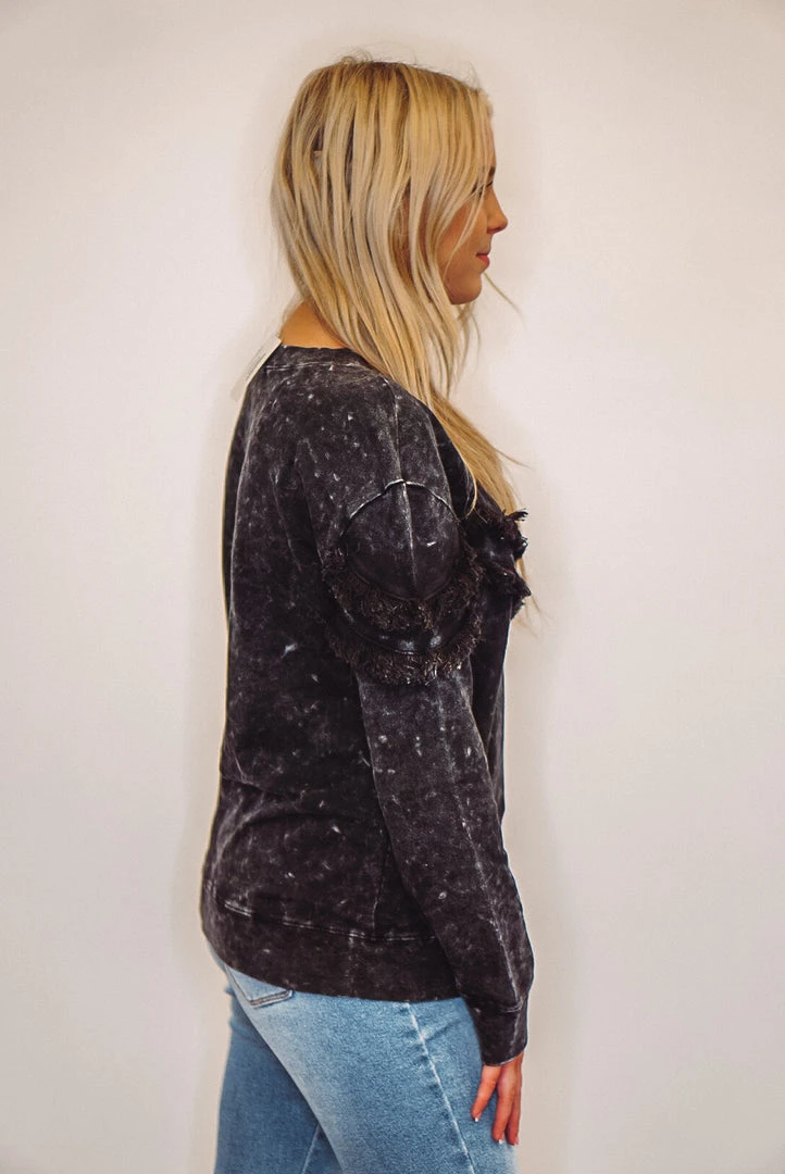 We are in love with this black charcoal french terry lightweight pullover! So comfy, and super cute! Featuring our favorite mineral washed fabric, relaxed fit, and frayed fringe details across the front and around the shoulders in back. You will love how great you feel in this babe. Perfect for all of the places life takes you!