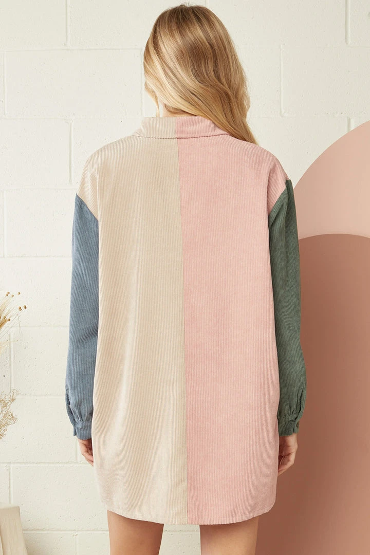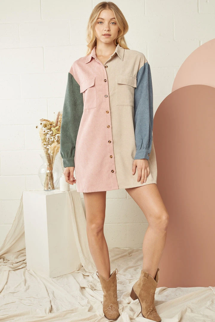Corduroy is an American classic, and you will love this new twist on the classic style with this really sweet colorblock dress. Featuring button front closure, button cuffed long sleeves, chest pockets, and colorblock colors of blush, taupe, blue, and olive. Just throw on your favorite booties, and you’ll be ready for all of your upcoming Autumn events.