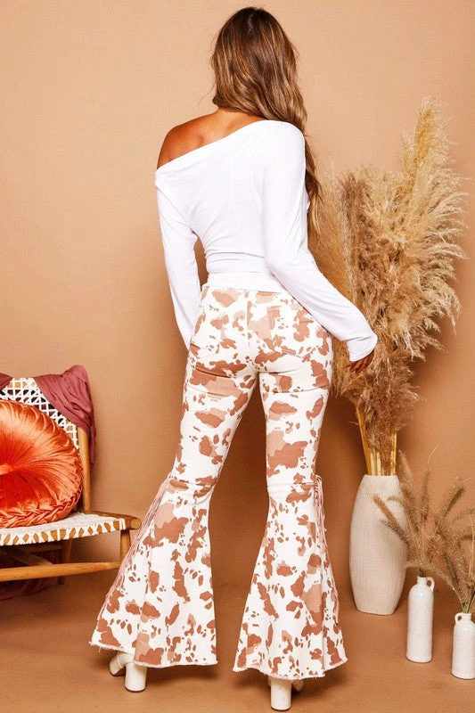 We love everything about these super cute cow print denim flares! These babies are high waisted bell bottom jeans in brown and cream cow print with a flattering fitted and flared cut. Featuring a front zip fly closure, back pockets, and the best part…. fringe down the outside where the jeans flare! So CUTE! Perfect for all of those upcoming concerts and festivals!