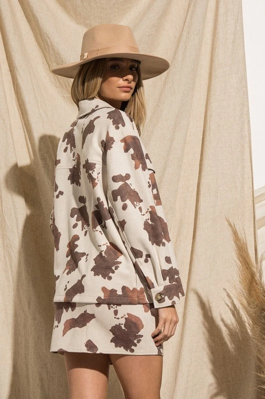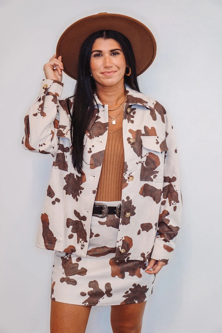 We LOVE this lightweight jacket! Featuring brown and cream cow print pattern, button front closure, button cuffed long sleeves, front pockets on the chest, and open seam pockets on the sides, with the softest suede feeling fabric. Lightweight jackets are so versatile, and are definitely a staple piece every closet needs. You’re going to love this one all year long! Grab the matching skirt for the complete look.