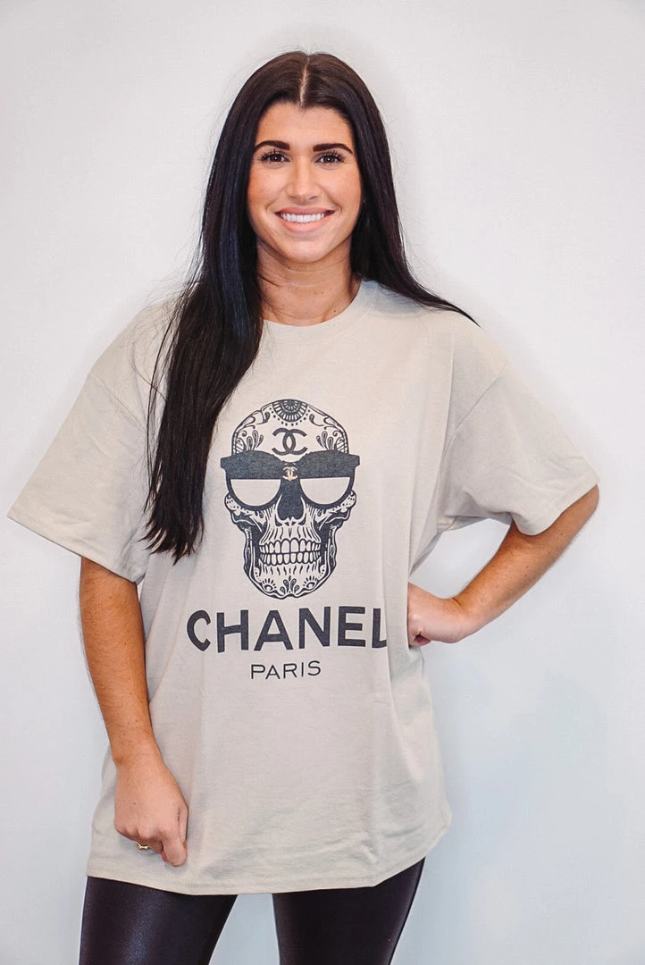 CC skull sunglasses with black print graphic tee.