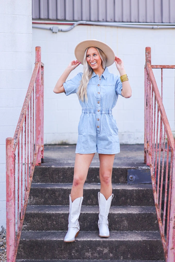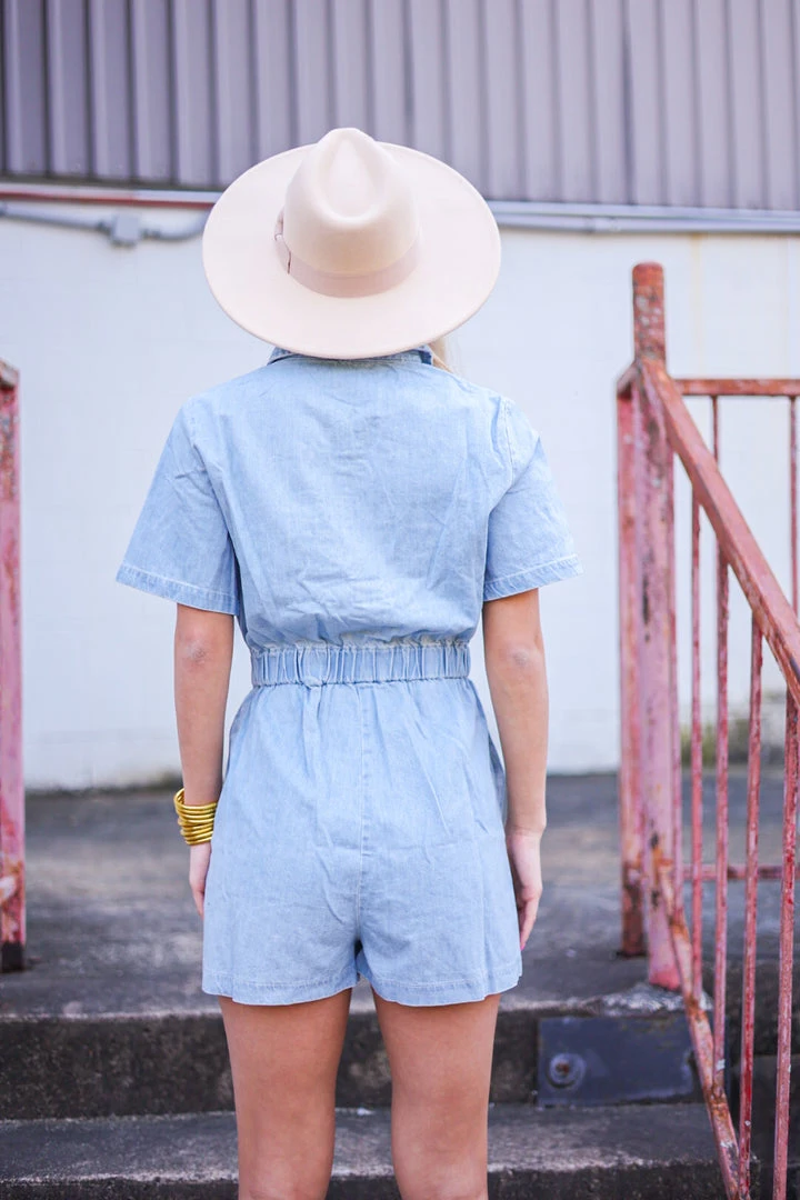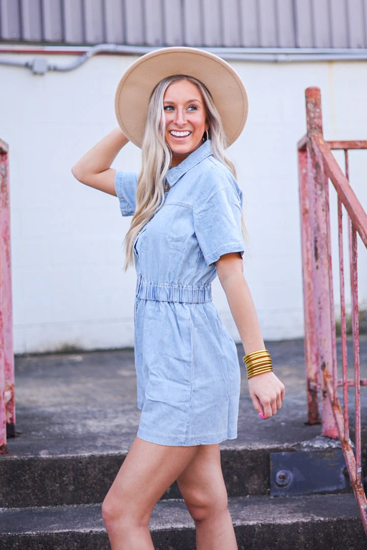The must-have romper for all of your summer occasions. From date nights to beach trips you will feel super trendy in this adorable romper!! Featuring a lightweight chambray fabric, button down front, v neckline with collar, short sleeves, elastic waist, and pockets. Absolute perfection!