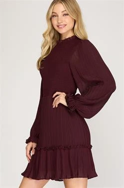 You’re going to love this one girls! Smocked dress, in a very pretty wine color. Featuring a smocked top and flowy bottom, a ruffled high neckline with a keyhole button closure in back, ruffle cuffed long sheer sleeves, a flowy pleated skirt, and a ruffled hem at the bottom. This beautiful babe is lined, and has a true to size fit. She’ll be perfect for any special occasion, from Wedding events, to Holiday parties, and the color will transition beautifully into the upcoming seasons.