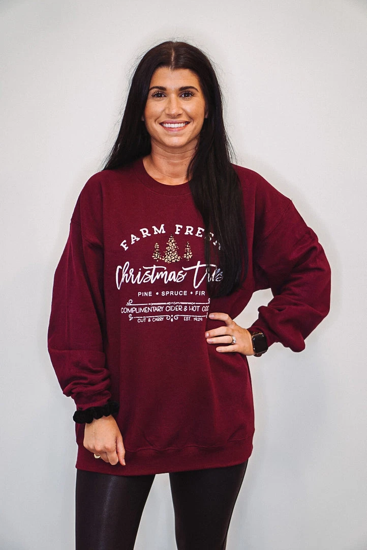 It’s beginning to look a lot like Christmas! We LOVE this Farm Fresh Christmas Trees graphic sweatshirt. Featuring a very pretty heathered burgundy color with crew neckline and cuffed long sleeves. Super cute and comfy!! We will be wearing this babe all season long.