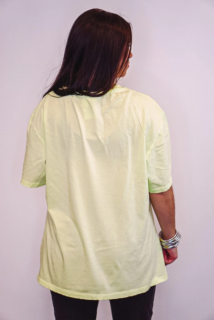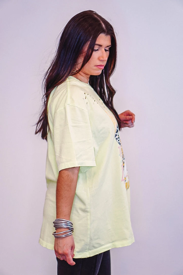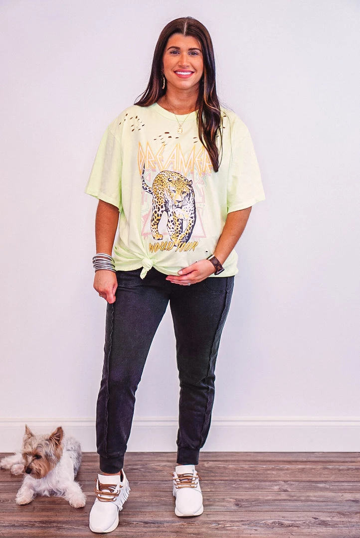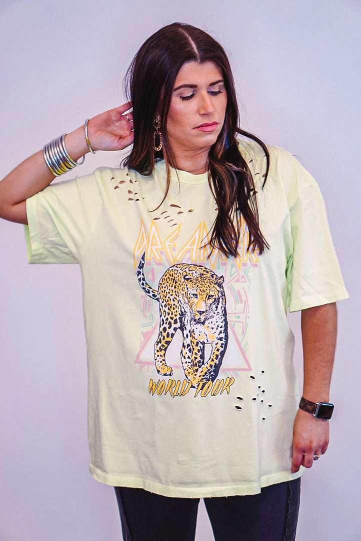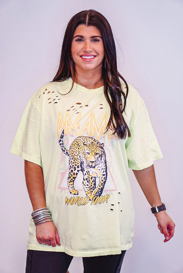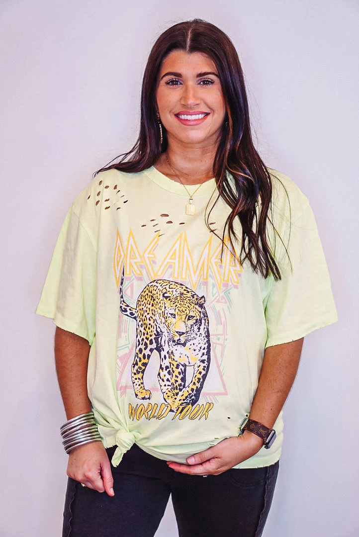Trendy little must have tee! Distressed graphic tee in neon lime featuring a crew neckline, short sleeves, and the words Dreamer World Tour in vintage print with a leopard printed in the middle. Perfect with some biker shorts!