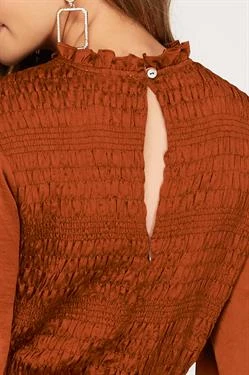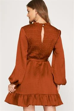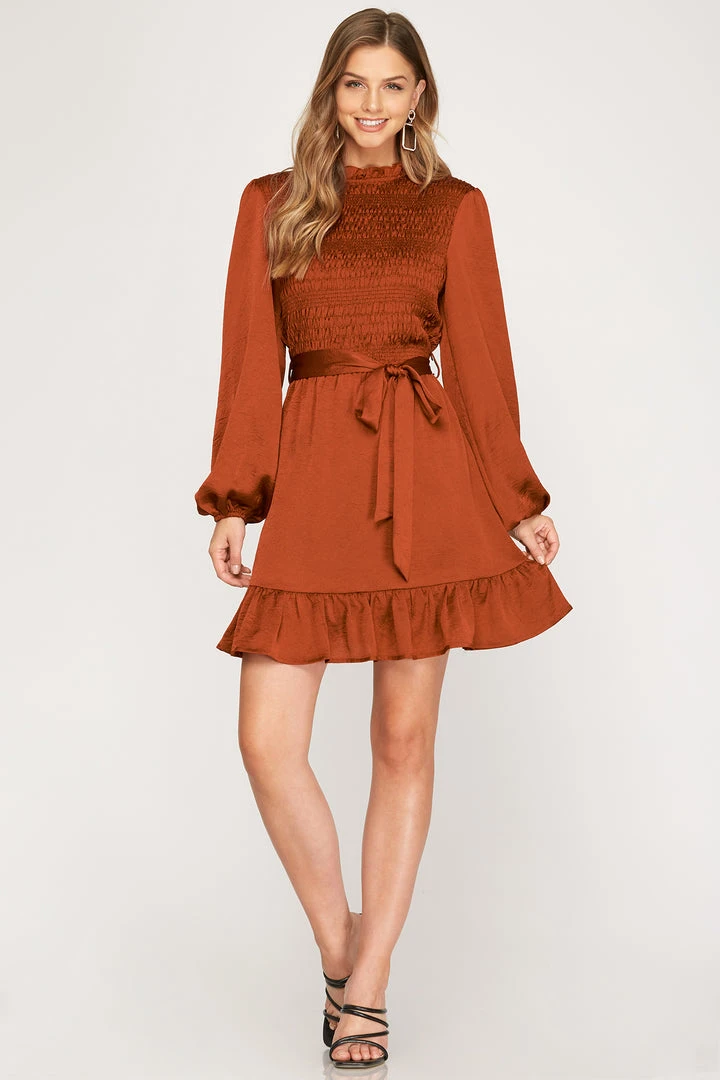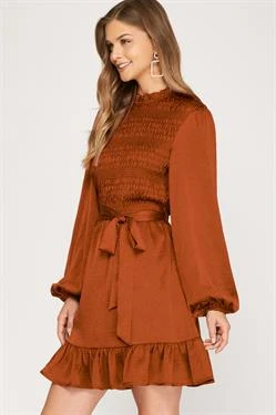 Dark rust satin smocked long sleeve dress