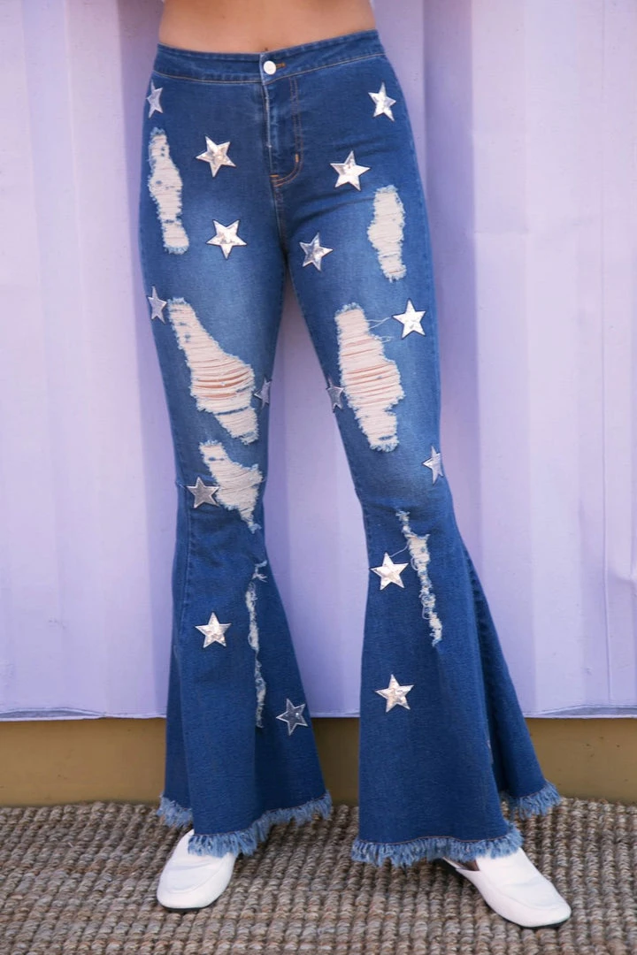 Distressed dark denim flare jeans with sequin stars detail.