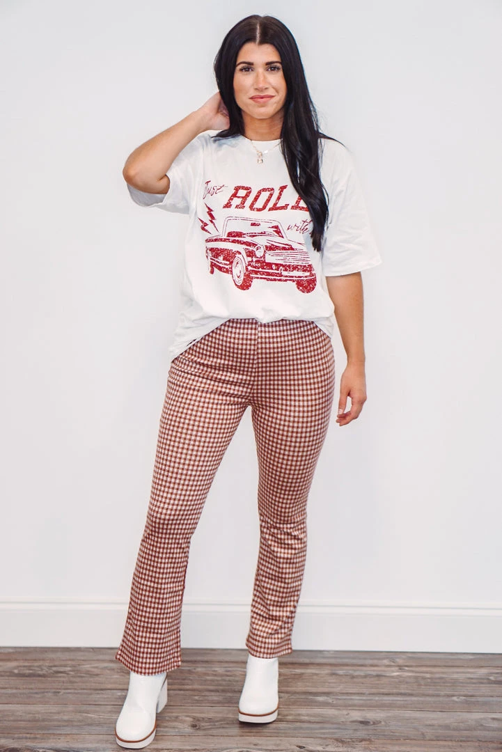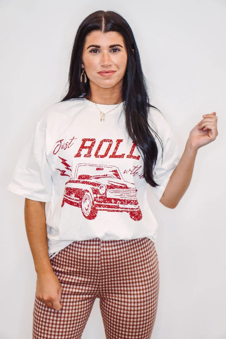 This graphic tee is so cute! Short sleeve oversized ivory tee, featuring a convertible and the words “just roll with it” printed in brick red, with distressing on the crew neckline, and bottom hemline. Perfect under your favorite blazer for a fun trendy look, or thow her on with your denim jeans for a casual day out.