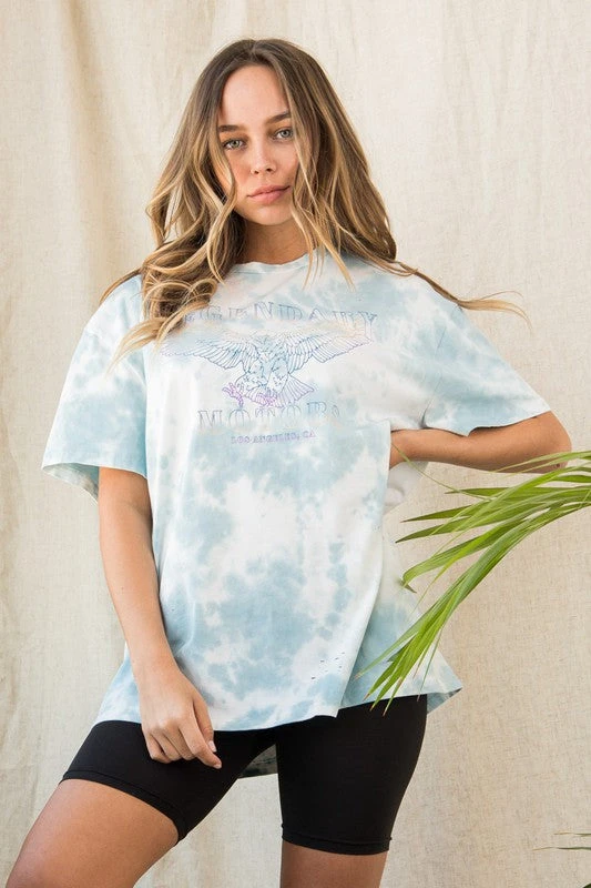 - Light blue tie dye tee with colorful eagle design