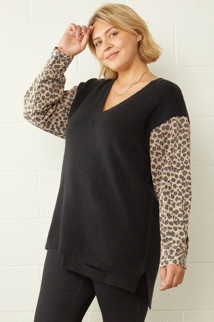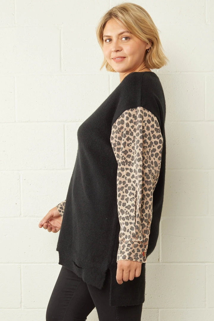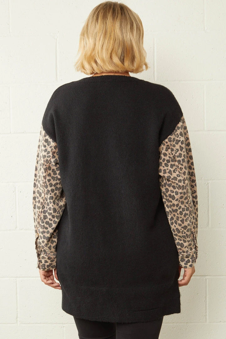 Black knit sweater with denim leopard print sleeves