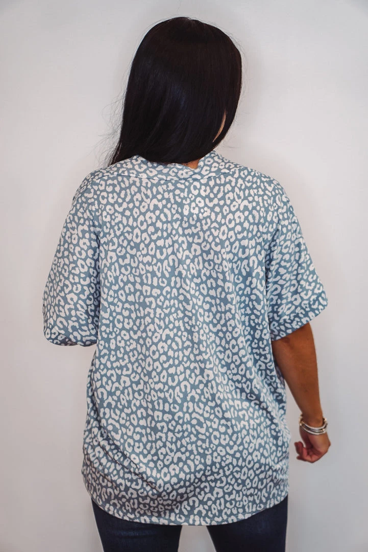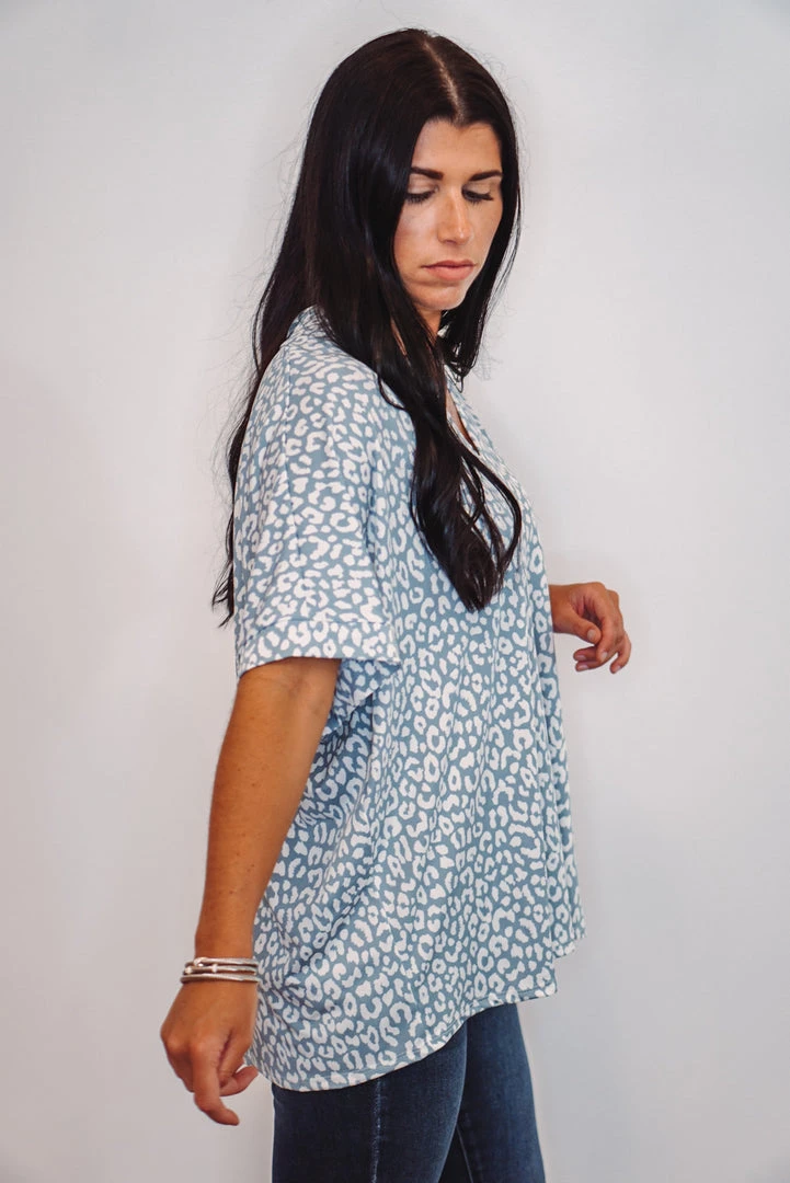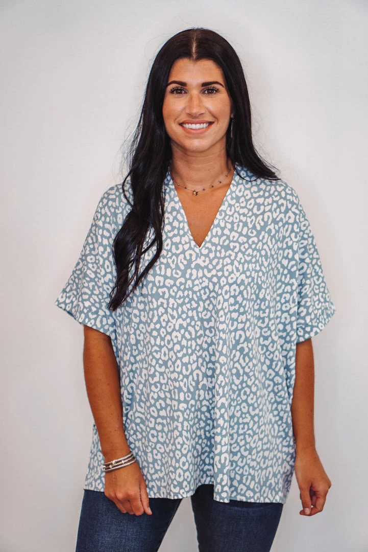 Such a fun boxy top! Powder blue leopard print with a V-neckline and short dolman sleeves. Super cute and comfy! Perfect worn long, or with a side tuck for a more fitted look. Dress this one up or down, super cute either way!