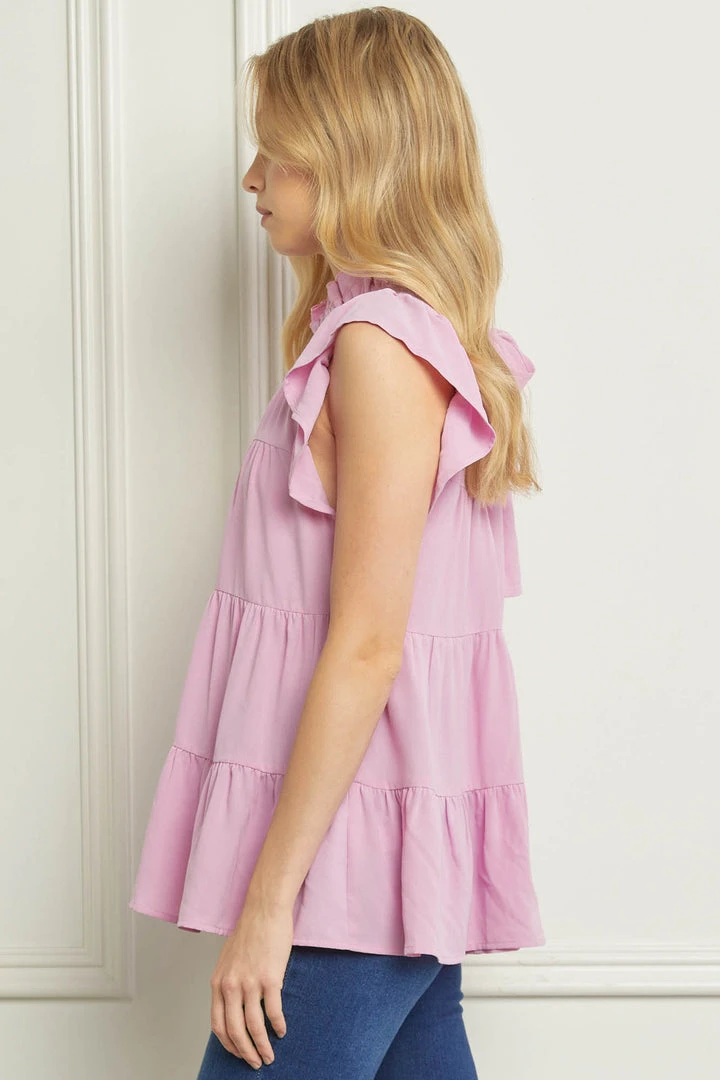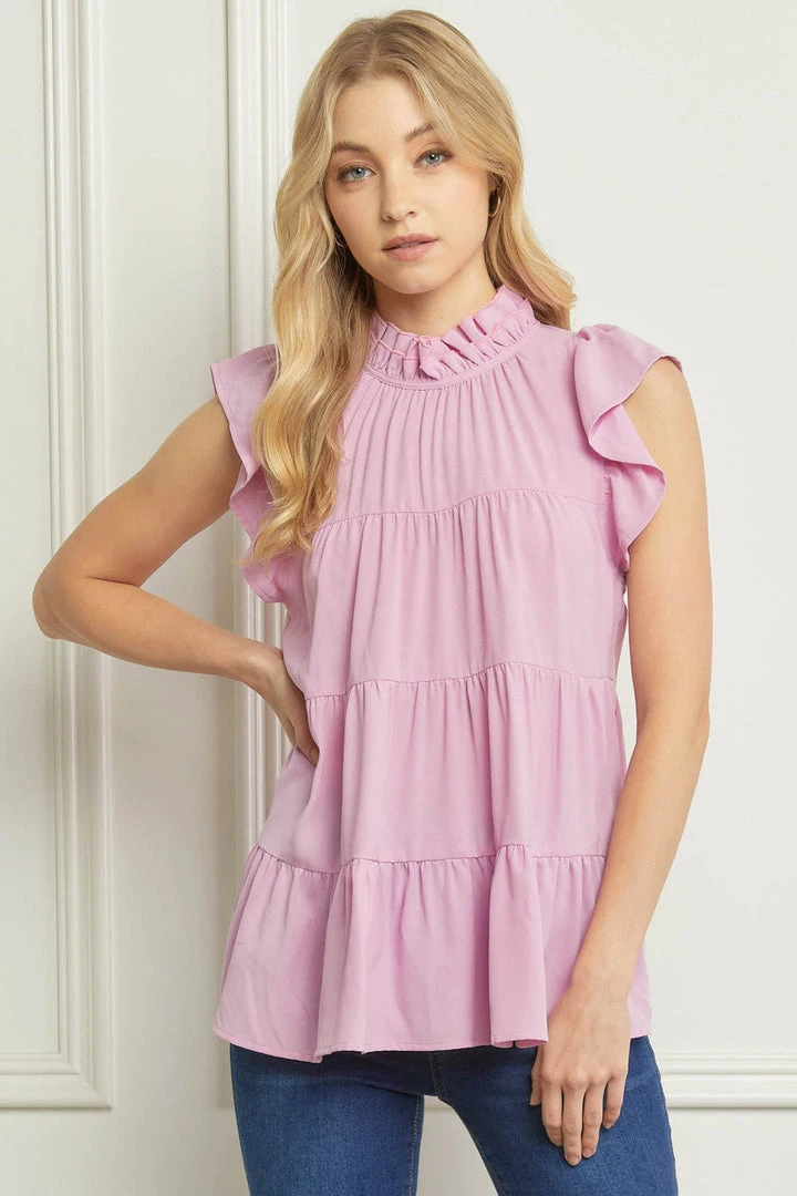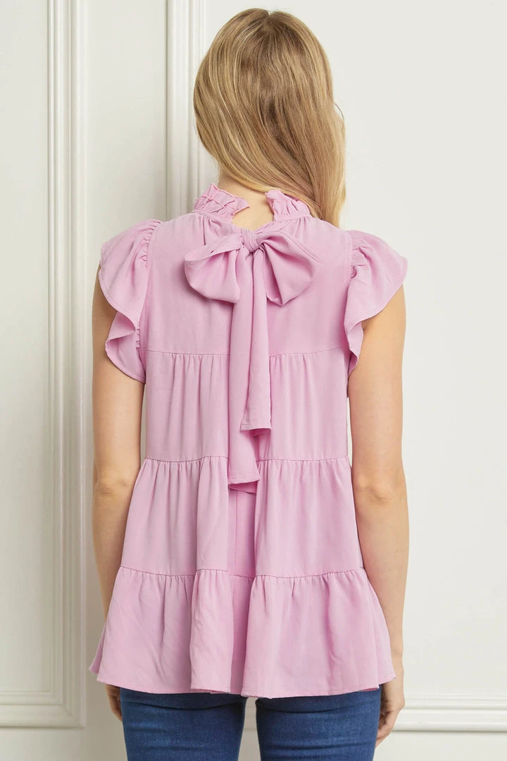 The perfect little top for all of your upcoming occasions… just add your favorite jeans and sandals or booties and you’re set. Solid top with a ruffled mock neckline that ties in the back, ruffled cap sleeves, and tiered layers. So cute!