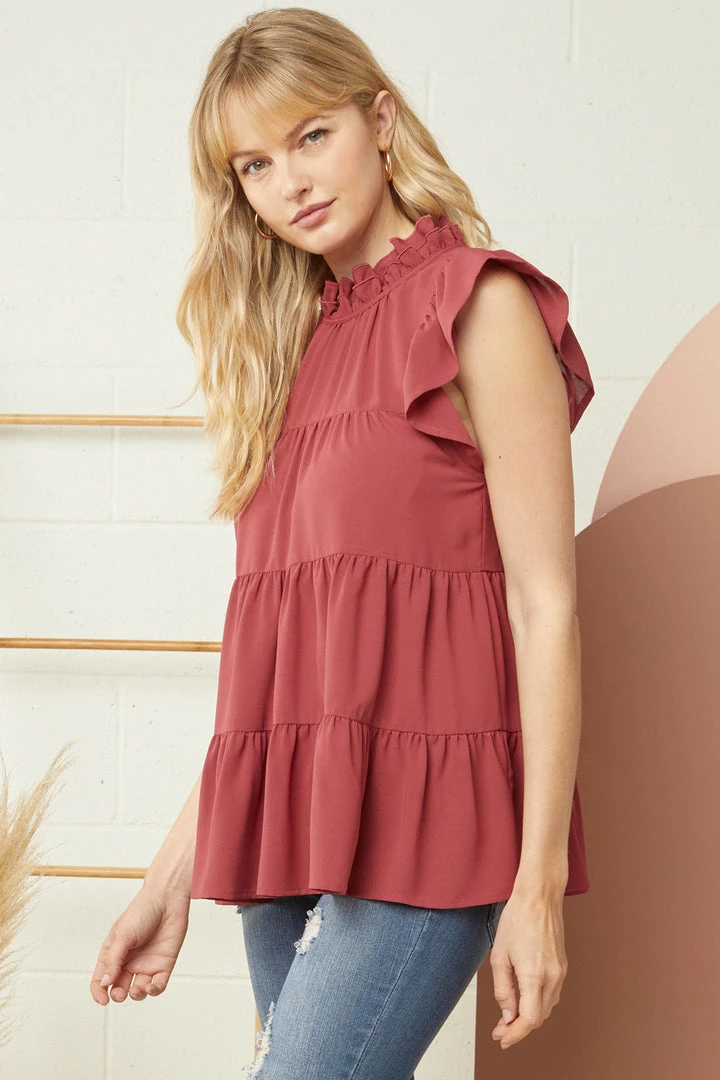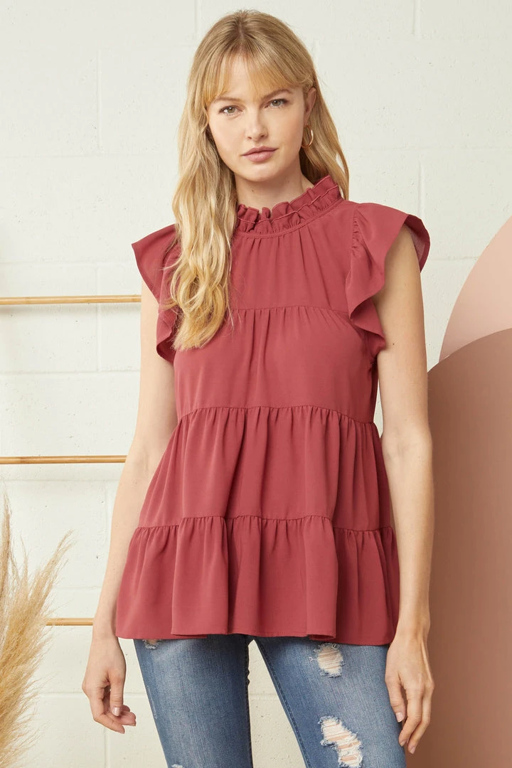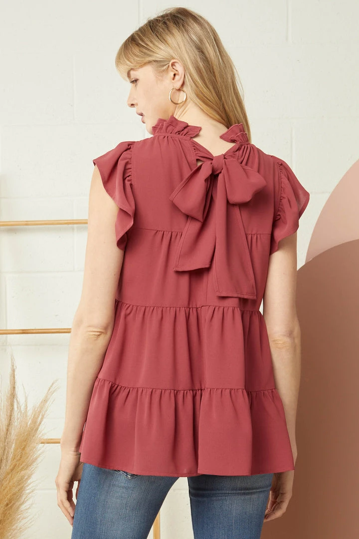 The perfect little top for all your upcoming occasions… just add your favorite jeans and sandals or booties for the Fall and you’re set. Solid top with a ruffled mock neckline that ties in the back, ruffled cap sleeves, and tiered layers. So cute!