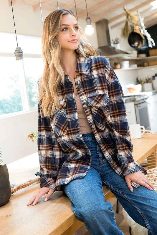 Navy, brown and ivory plaid flannel shacket