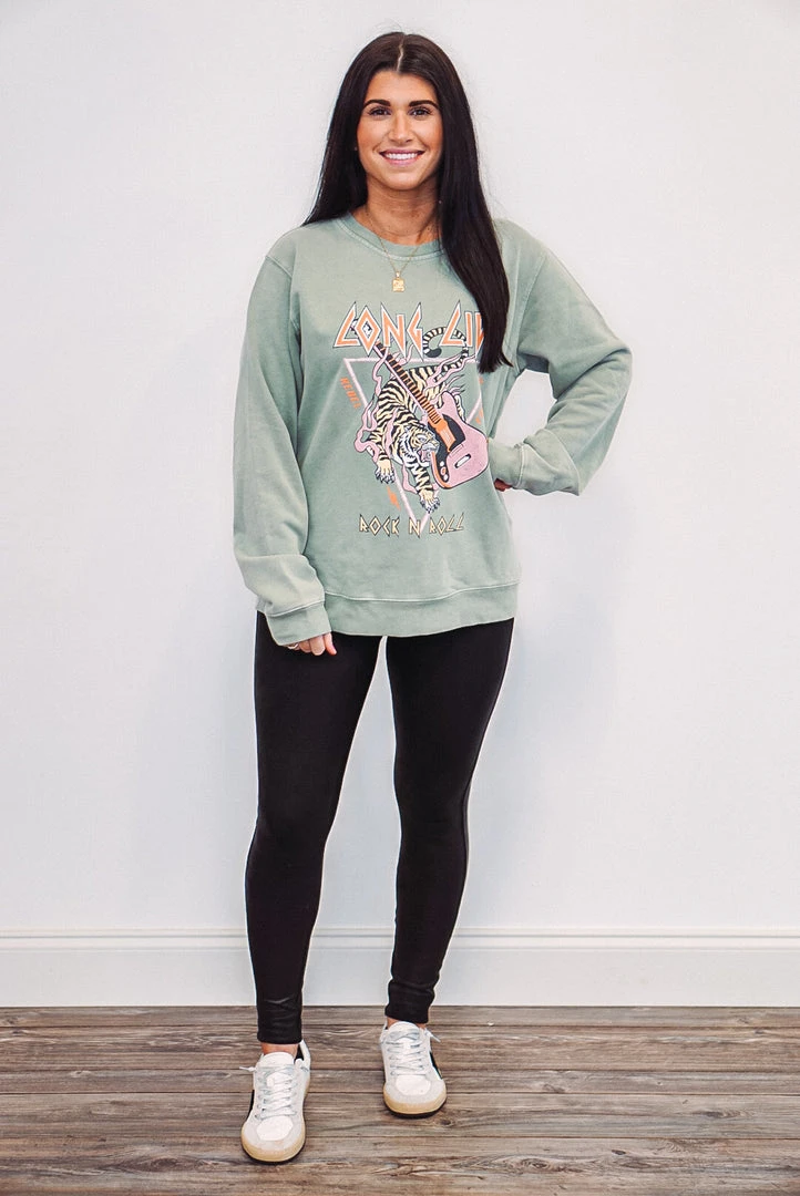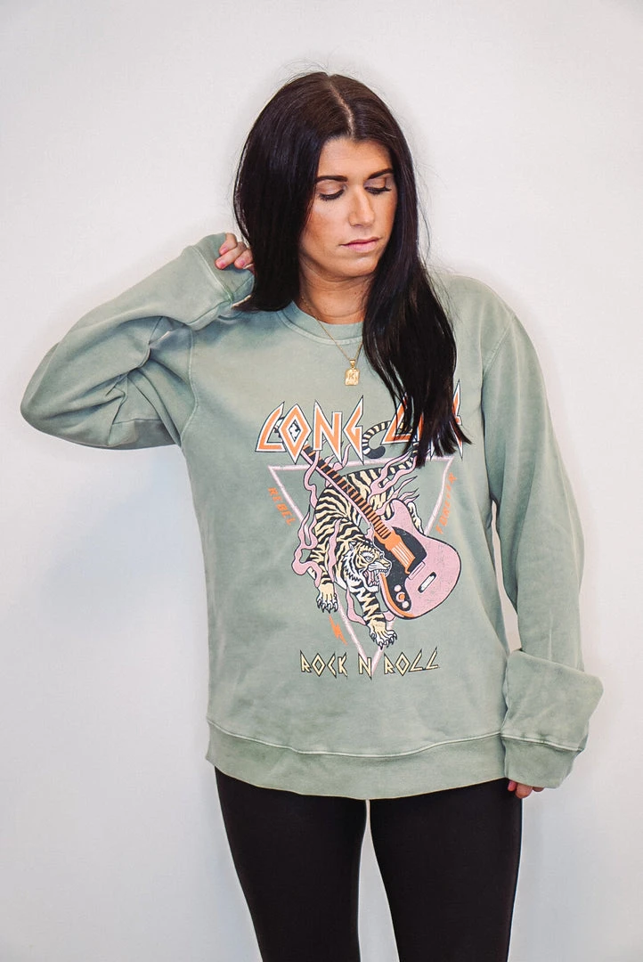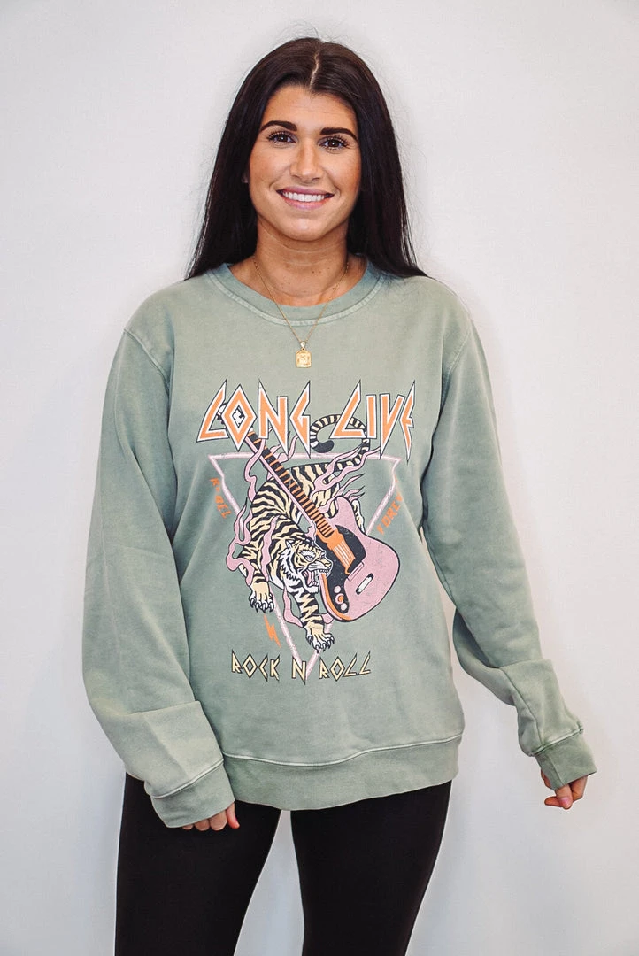 Everyone loves a cute french terry knit pullover! This babe is in our favorite mineral washed fabric and features a vintage graphic design of a tiger and guitar, with the words Long Live Rock N Roll, and Rebel Forever. Such a perfect graphic sweatshirt!