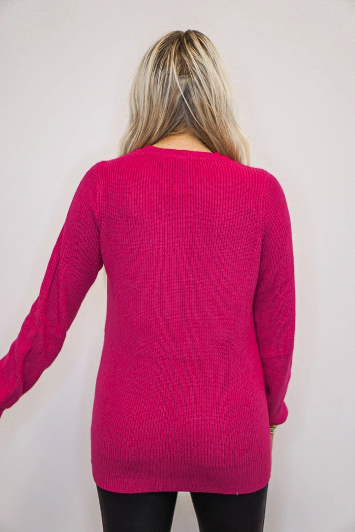 Ladies hot pink crew neck sweater with cut out