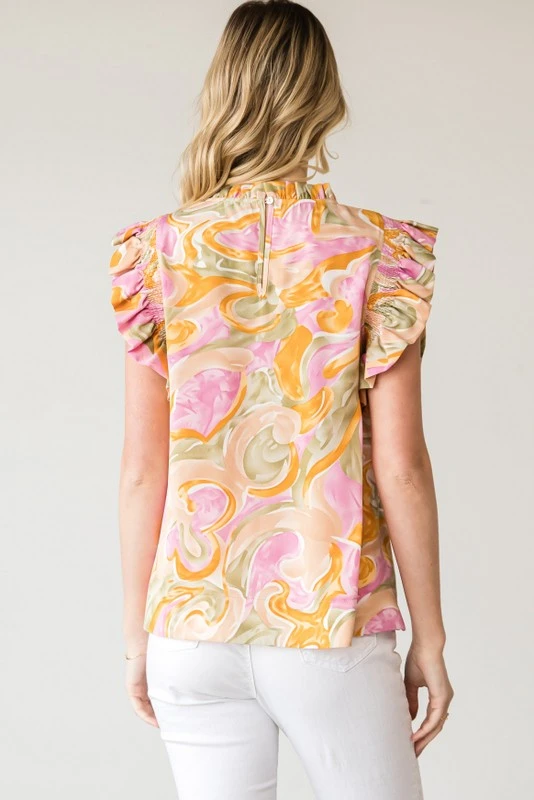 We are over the moon about this super cute blouse! Featuring ruffled mock neck with keyhole button closure in back, ruffle capped smocked sleeves, and the prettiest flowy fabric. Can be worn long, or with a front tuck, the choice is yours. So pretty! Light and dark swirled colors: sage, pink, taupe, ivory, and mustard.