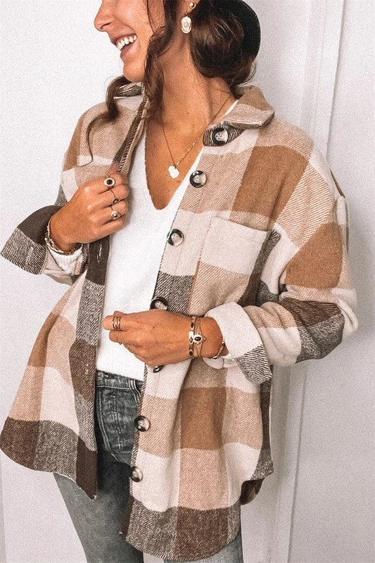 Caramel, brown and tan checkered plaid flannel shacket