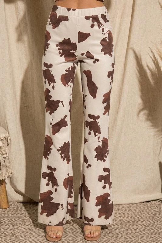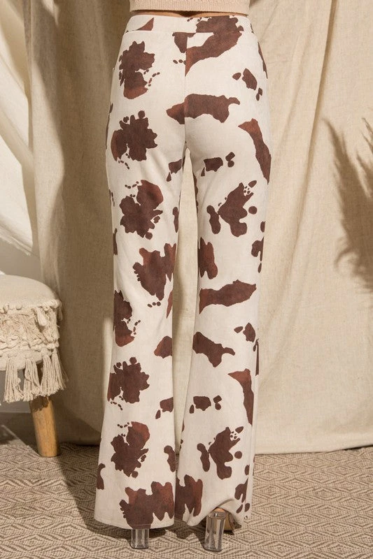 Brown and cream cow print suede feel flared pants