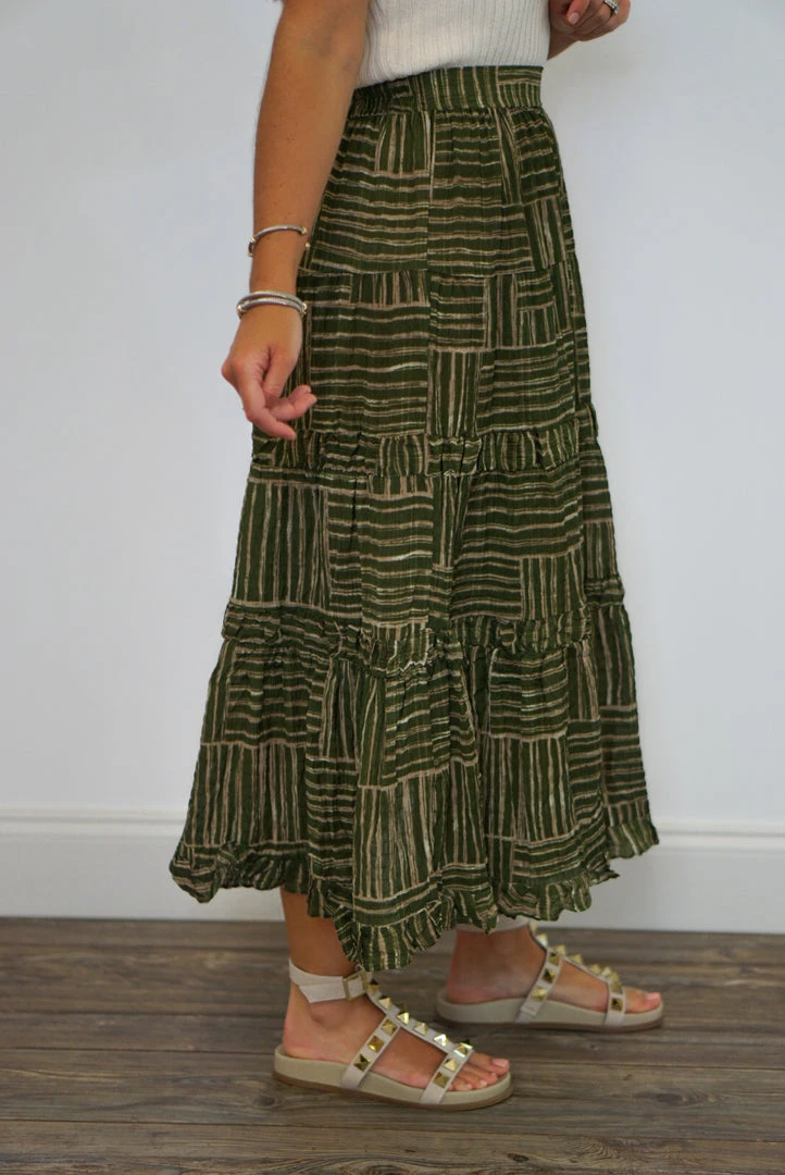 Olive and taupe tiered boho style midi skirt