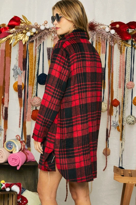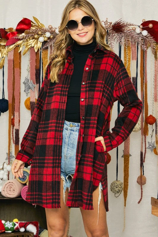 Bring in the Winter season with this classic red and black plaid flannel shacket. So cute and comfy, featuring a button up style, side pockets, mid weight fabric, and a longer length to keep you warm and cozy. It’ll be the perfect addition to your wardrobe and great to layer with your graphic tees and jeans. This babe is a must have!!