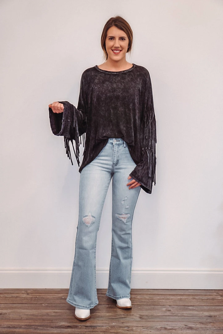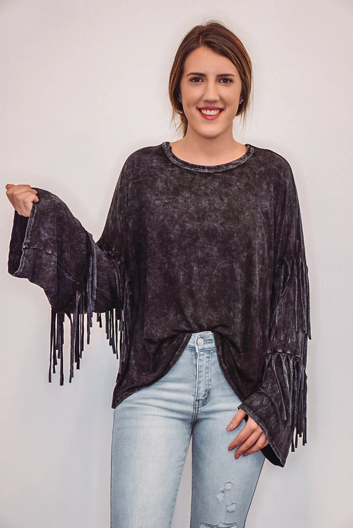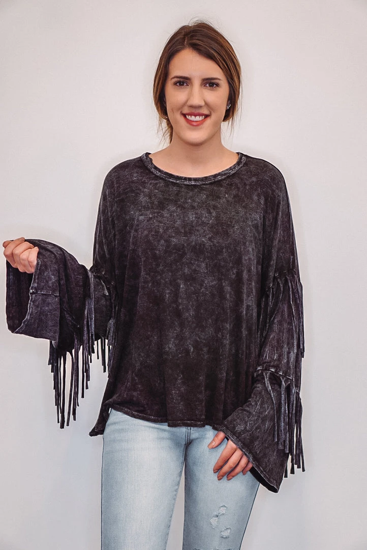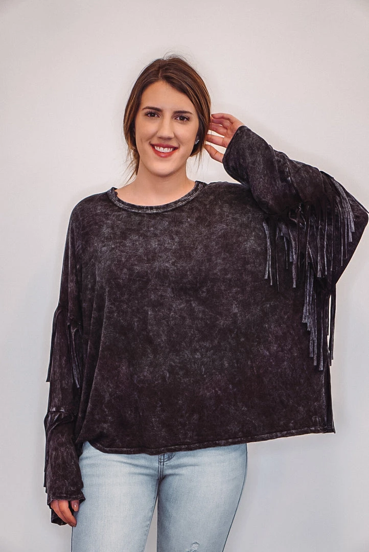 Kick the dust up in this super hot mineral washed black top. Features layered fringe down the long sleeves, a crew neckline, raw seam slits on each side at the bottom, and has a relaxed boxy fit. Perfect for concerts, tailgating, or a bonfire with friends. The mineral washed fabric makes it soft, and very comfy, while looking fab!
