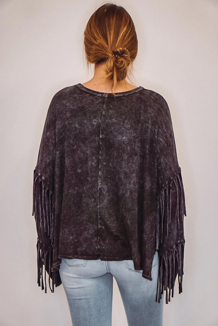 Black mineral washed fringe sleeve top