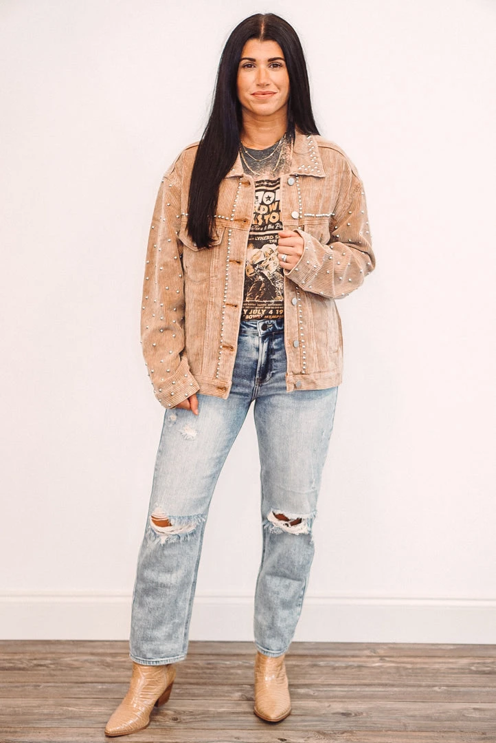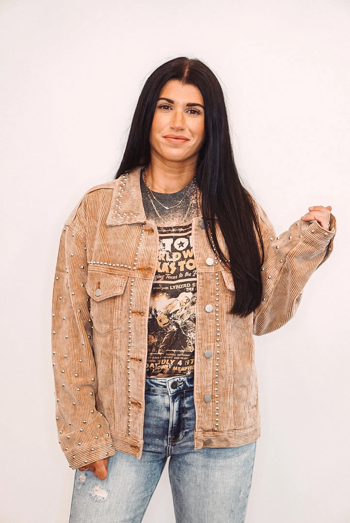 Band tees are always a top pick! So many ways to style them and you can wear any kind of graphic tee all year long. Love this ZZ Top tee paired with our trendy chic corduroy studded jacket!