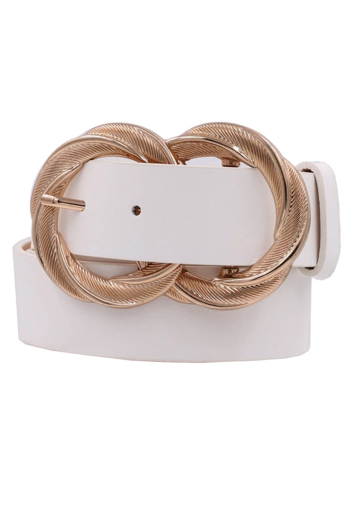 Large twisted metal buckle faux leather white belt.