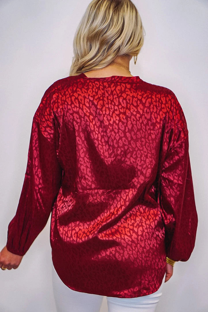 Burgundy satin monochromatic leopard print blouse