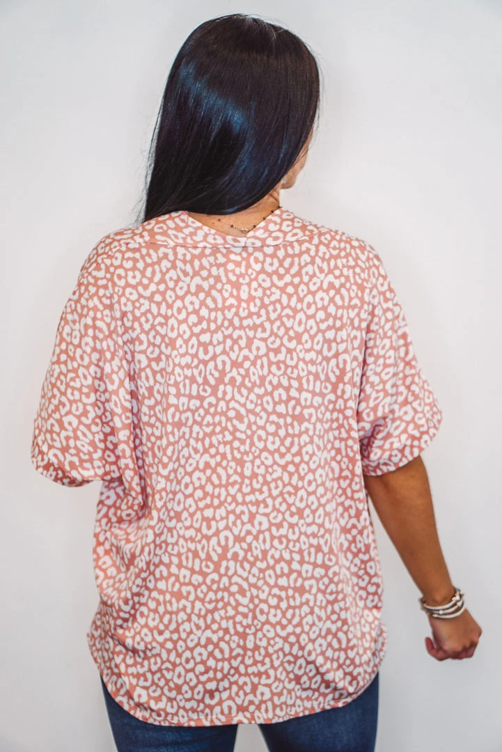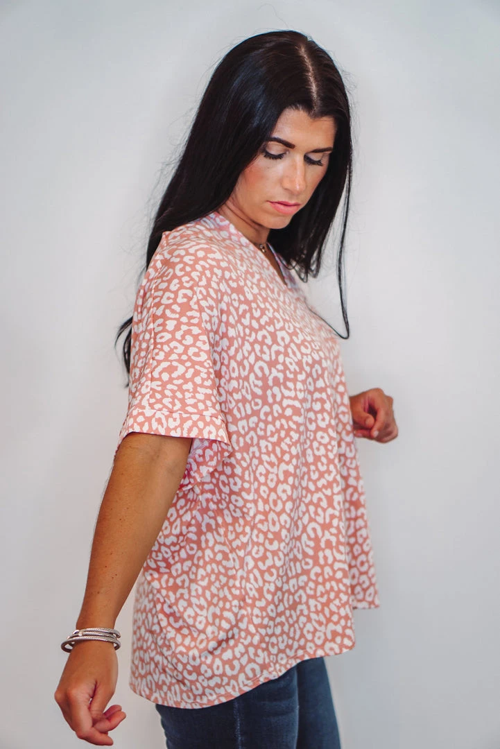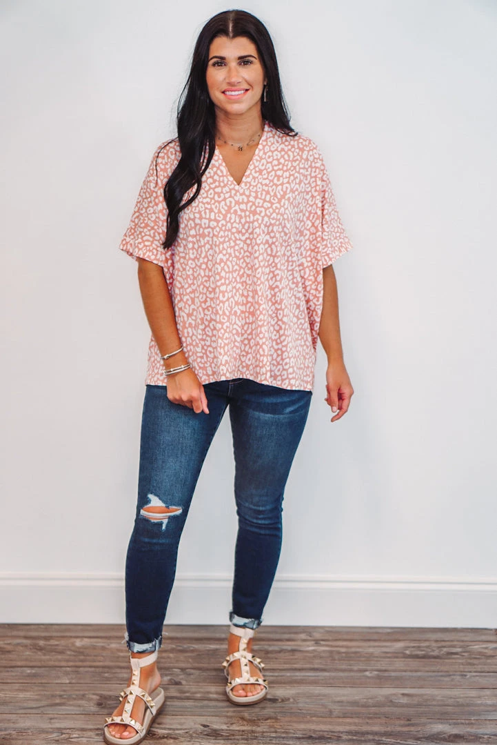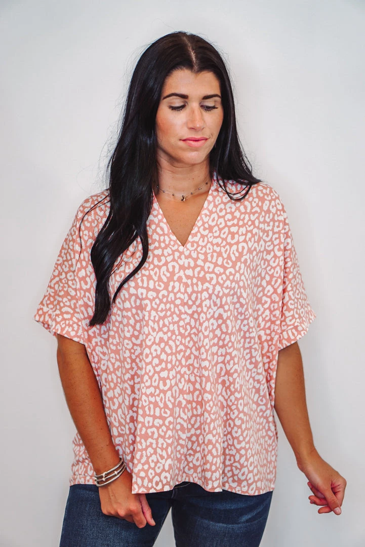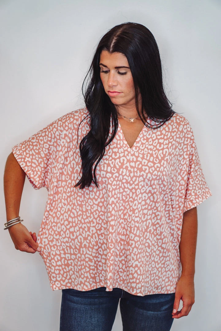 Such a fun boxy top! Salmon leopard print with a V-neckline and short dolman sleeves. Super cute and comfy! Perfect worn long, or with a side tuck for a more fitted look. Dress this one up or down, super cute either way!