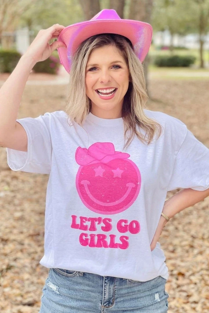 Let your inner Shania Twain show in the cutest let’s go girls pink and white graphic tee. Features an adorable smiley face wearing a cowgirl hat. These would be SO CUTE for your Nashville bachelorette trips.