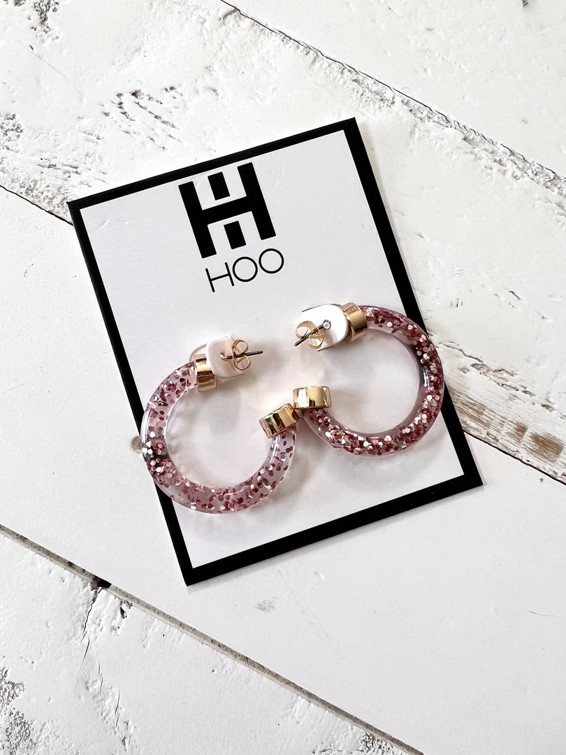 These babes are sooo cute! Acrylic mini hoop earrings in light pink glitter, hypoallergenic, and lightweight. Love, love, love!!
