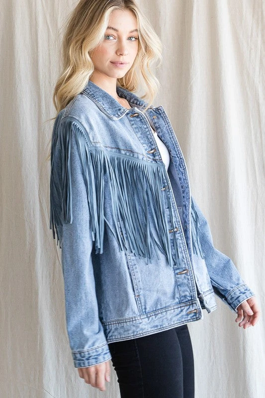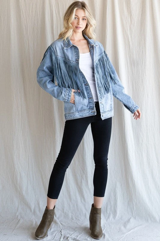 A denim jacket with a TWIST! This light washed blue denim jacket is a MUST have to rock all year long! Jacket features blue suede fringe across the chest in front and around the shoulders of the sleeves in back. This babe is perfection!