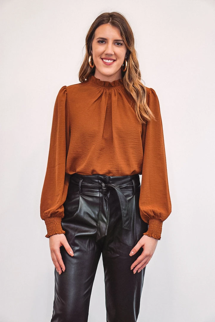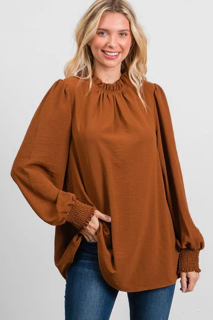 The ruffled mock neck and smocked sleeves adds just the right amount of sass. This toffee top features a lightweight fabric that is great for layering, along with a relaxed silhouette. Super cute!